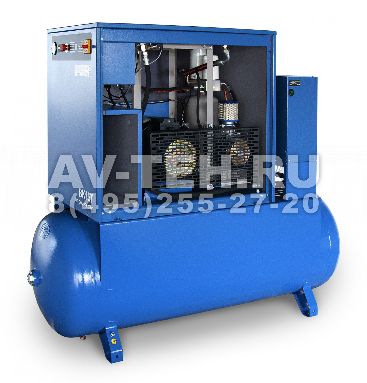 Компрессорная установка ВК15Т-15-500Д представляет собой компактную машину для производства сжатого воздуха, выполненную в шумопоглощающем корпусе на ресивере 500 литров , со встроенным осушителем воздуха и состоящую из следующих основных агрегатов, узлов и деталей: